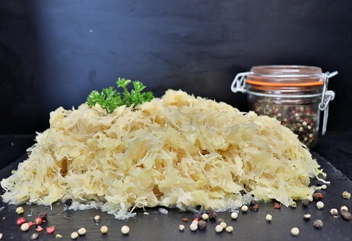 COMPOSITION : Choucroute d'alsace (chou, sel), bouillon (jus de cuisson,saint doux,riesling,arôme naturel, épices,sel,plante aromatique, antioxydant, acide ascorbique)