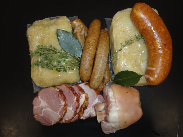 Ingrédients: Chou cuit (Choucroute (chou, sel), jus cuisiné (eau, sel, vin blanc (SULFITES) 2%, exhausteur de goût E621, arômes, antioxydant E301), saindoux 3%, baies de genièvre, feuille de laurier), 1 Jarrotin cuit, 4 saucisses fumées, Poitrine cuite, 1 Saucisson à l 'ail (Viande de porc français, sel nitrité, dextrose, stabilisants : triphosphates pentasodique, diphosphates tétrasodique ; sel et sel de guérande, conservateurs : érythorbate de sodium, ascorbate de sodium, aromes naturels, saccharose), acétate de sodium, ail (0,5%) (SULFITES), : carmin de cochenille ; antioxydant : acide ascorbique, poivre noir, muscade, boyau naturel de porc et de boeuf, fumage naturel).