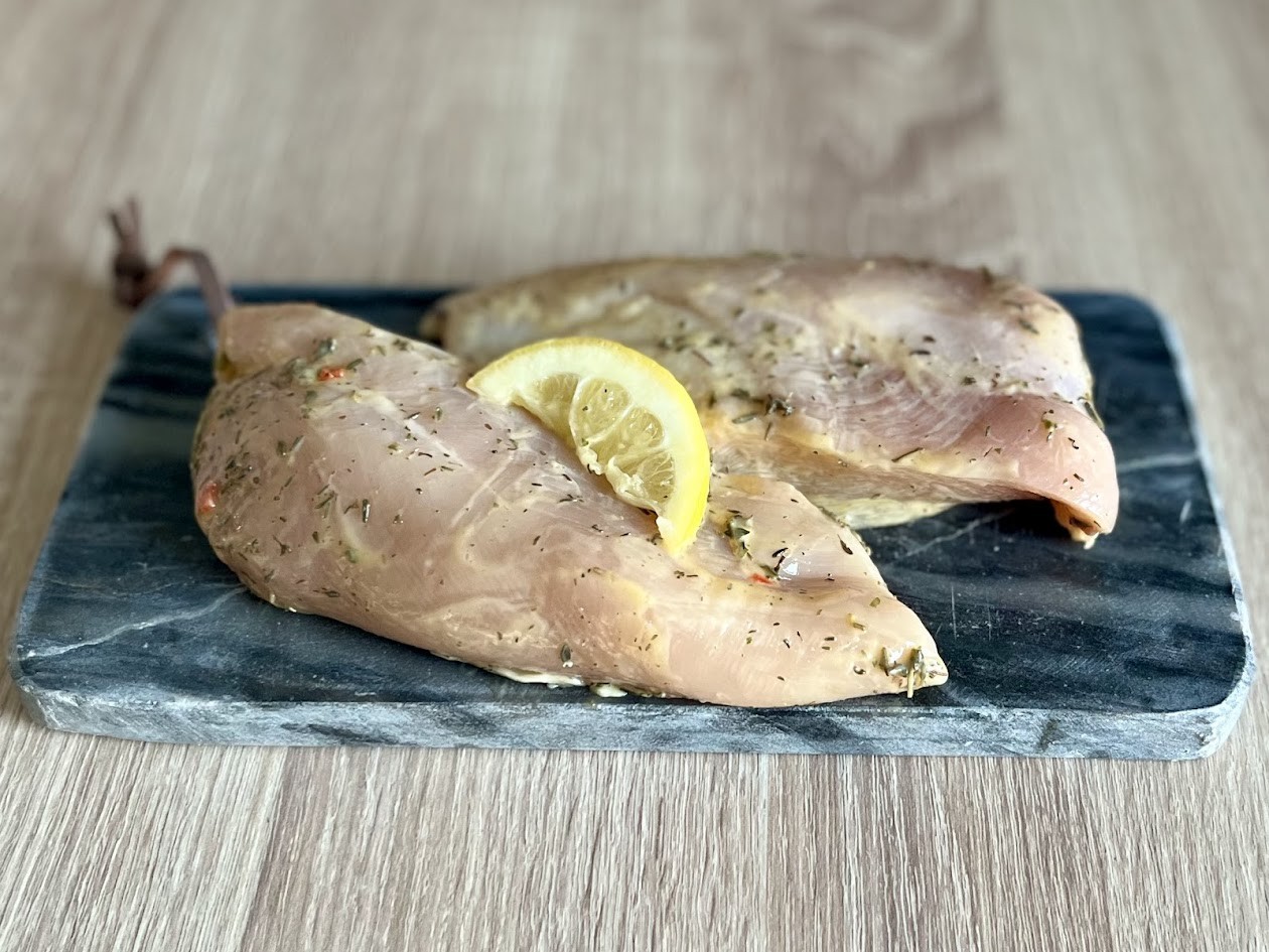 Ingrédients: Filet de poulet(84.4%) origine France; marinade:(mélange d’huiles végétales de colza (hydrogénée et non hydrogénée), tournesol, Sel, Plantes aromatiques dont(4%) de thym, Zeste et arôme de citron(0.63%), Arômes naturels, Acidifiant : E330); citron(5.6%)