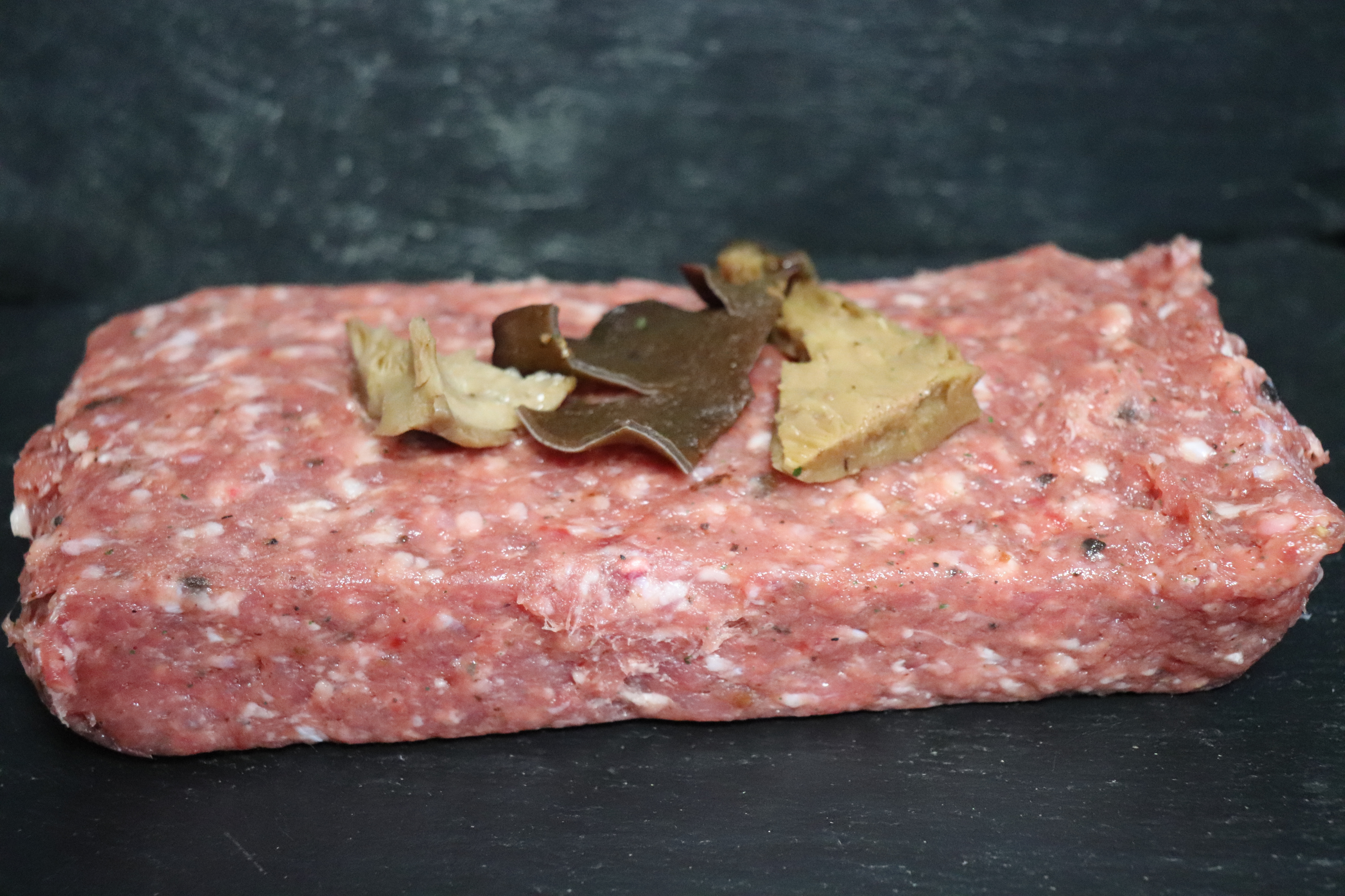 Ingrédients: Viande de volaille(77%),foie de volaille(10%),origine france, champignons déshydratés:(bolets,champignons noirs, pleurotes),sel arôme naturel,poivre.