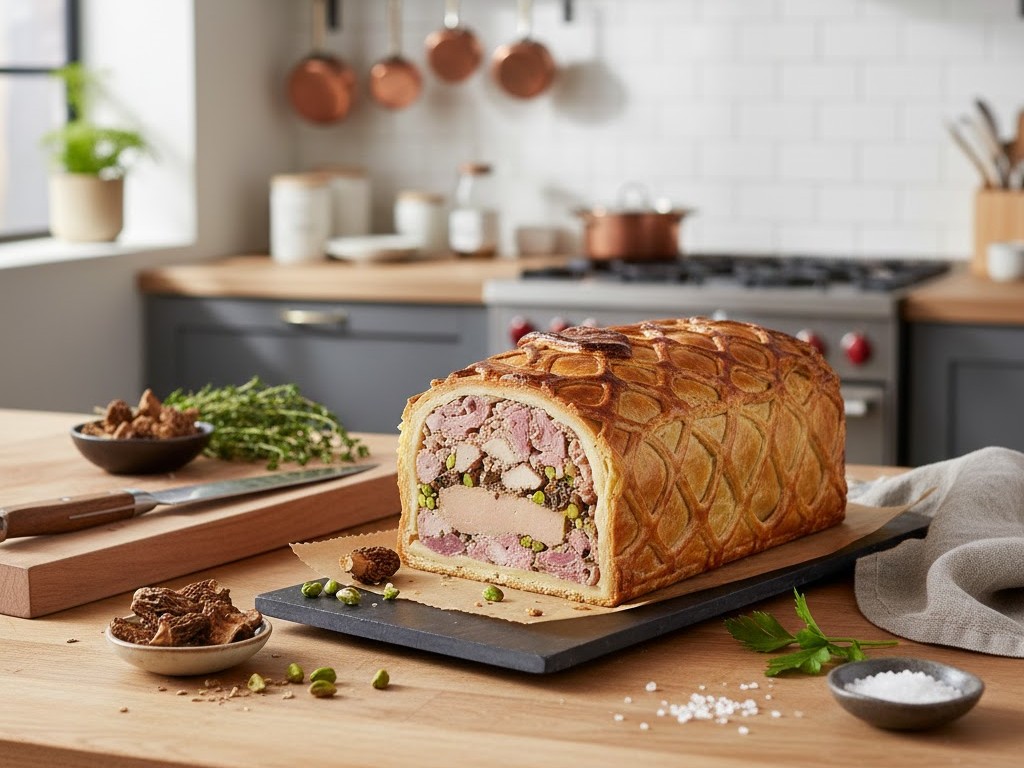 COMPOSITION : viande porc, viande pintade 20%, viande dinde, gelée (bouillon (eau, vin blanc, sel, Madère, conservateur(E250), aromates dont céleri, arôme naturel volaille), gélatine porcine), foie poulet, gras porc, vin blanc, foie canard, eau, œuf entier, graisse canard et poulet, LAIT, morilles 2%, champignons noirs 2%, pistaches, amidon riz, sel, Porto, Cognac, aromates, Marc Bourgogne, crème, sirop glucose, farine BLE, beurre, sucre, épices,colorant (E120), huile de tournesol, antioxydants (E300, E301), arômes, conservateur (E250), sucre vanillé (sucre, extrait naturel vanille, anti-agglomérant : amidon de maïs). Pâte : Farine blé, eau, beurre, saindoux, sel, colorant: E160a.