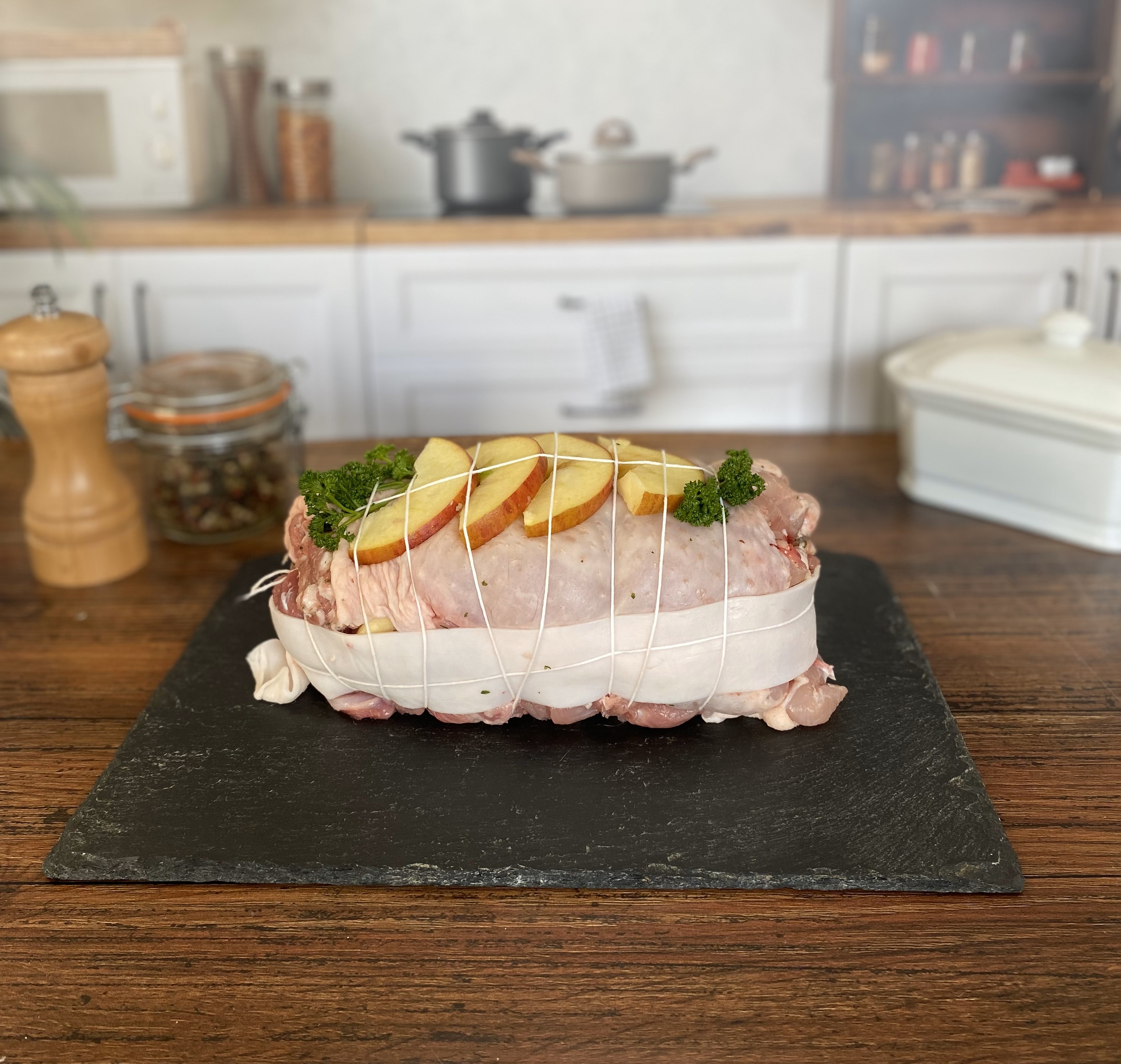 Ingrédients: Viande de chapon, farce : viande de porc, pomme 10 %, Calvados 2 %, arôme naturel, sel, poivre.